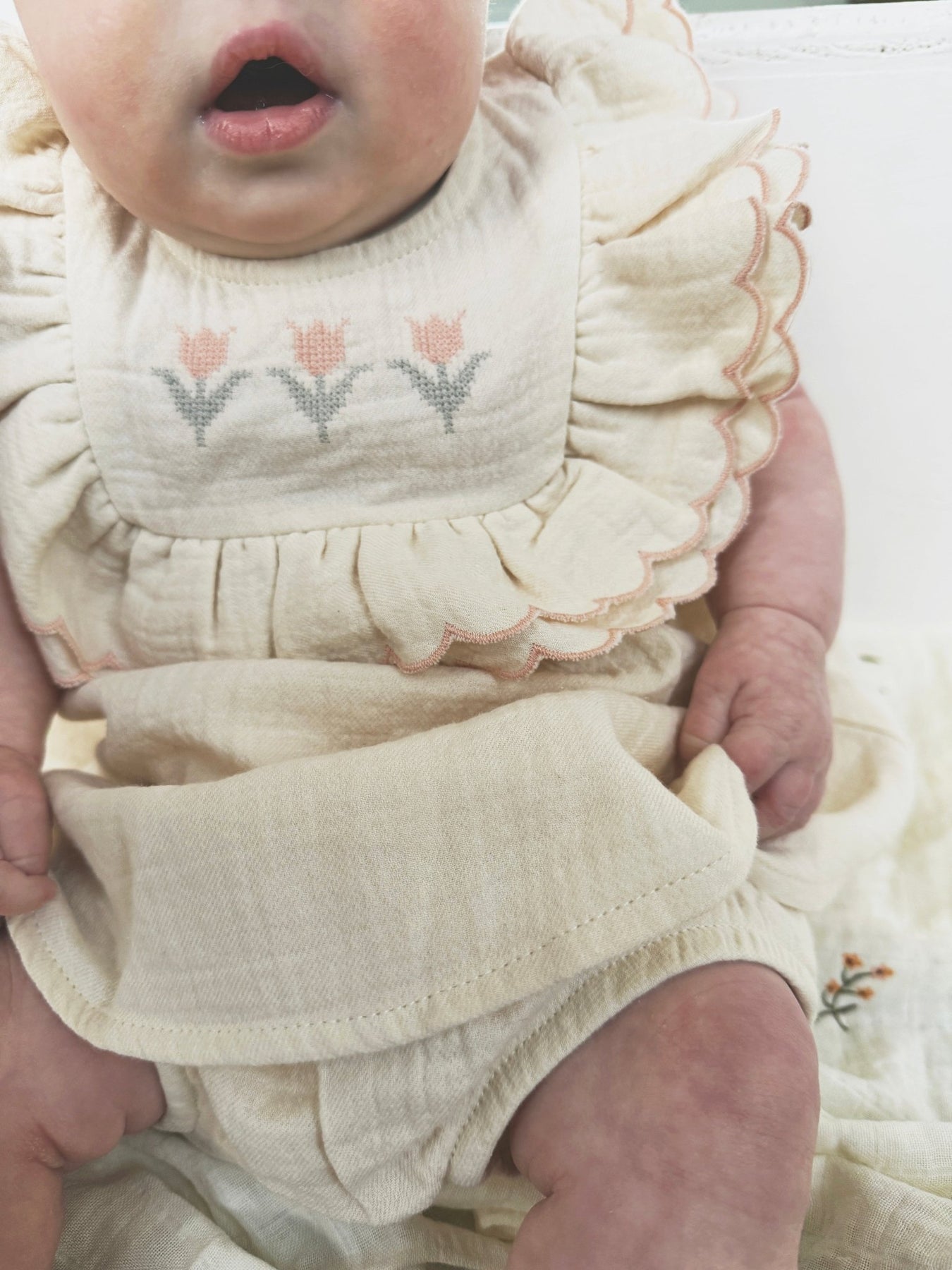 This dress is perfect for your springtime occasions. Featuring a gathered ruffle with merrowed edge detail along the chest with tulip embroidery and buttons on back for easy changes.
