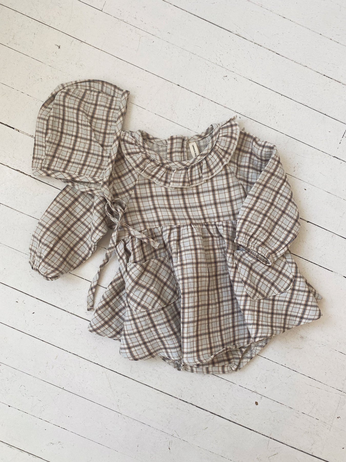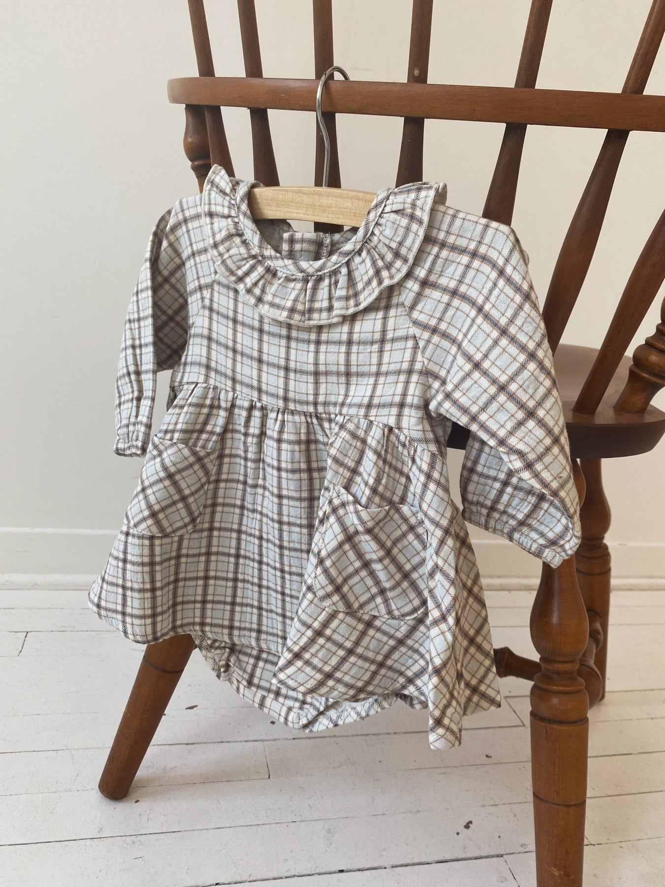 The sweet Simone Dress features long sleeves, a curved waistline, front patch pockets, and a darling collar. A zipper at the back allows for easy dressing—perfect for everyday charm and comfort. Coordinating bloomers included with all sizes.