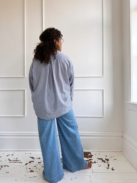 An easy classic, this lightweight button down is cut from breathable fabric with crisp vertical stripes. Designed with a relaxed fit and timeless collar, it’s perfect for layering over a tank, half-tucking into denim, or throwing on at the beach for effortless polish.