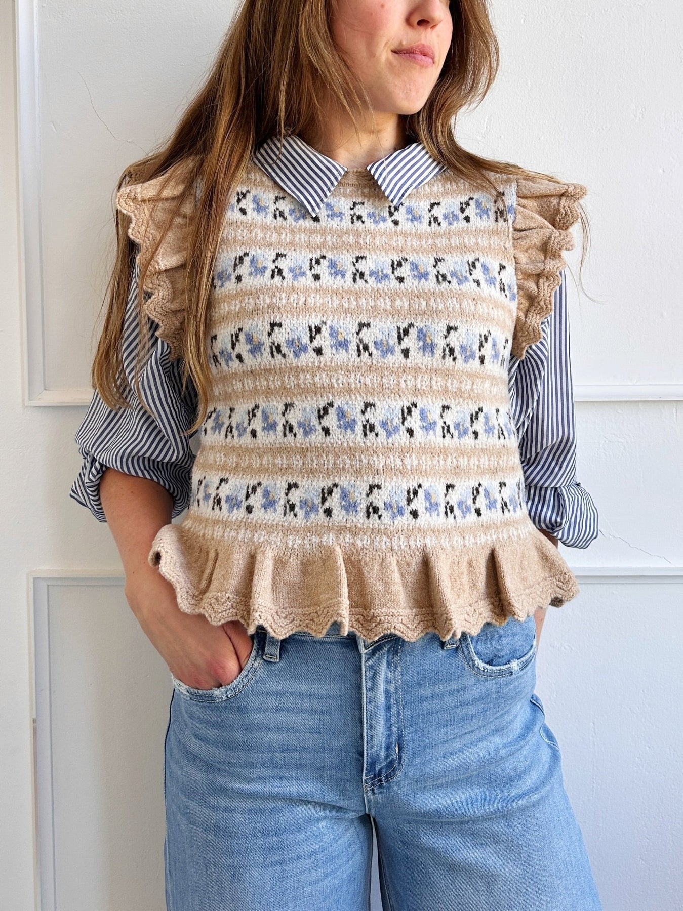 This knit vest is finished with scalloped edges and a sweet floral motif. A lightweight layer that feels both playful and timeless, perfect over crisp shirts or worn on its own.