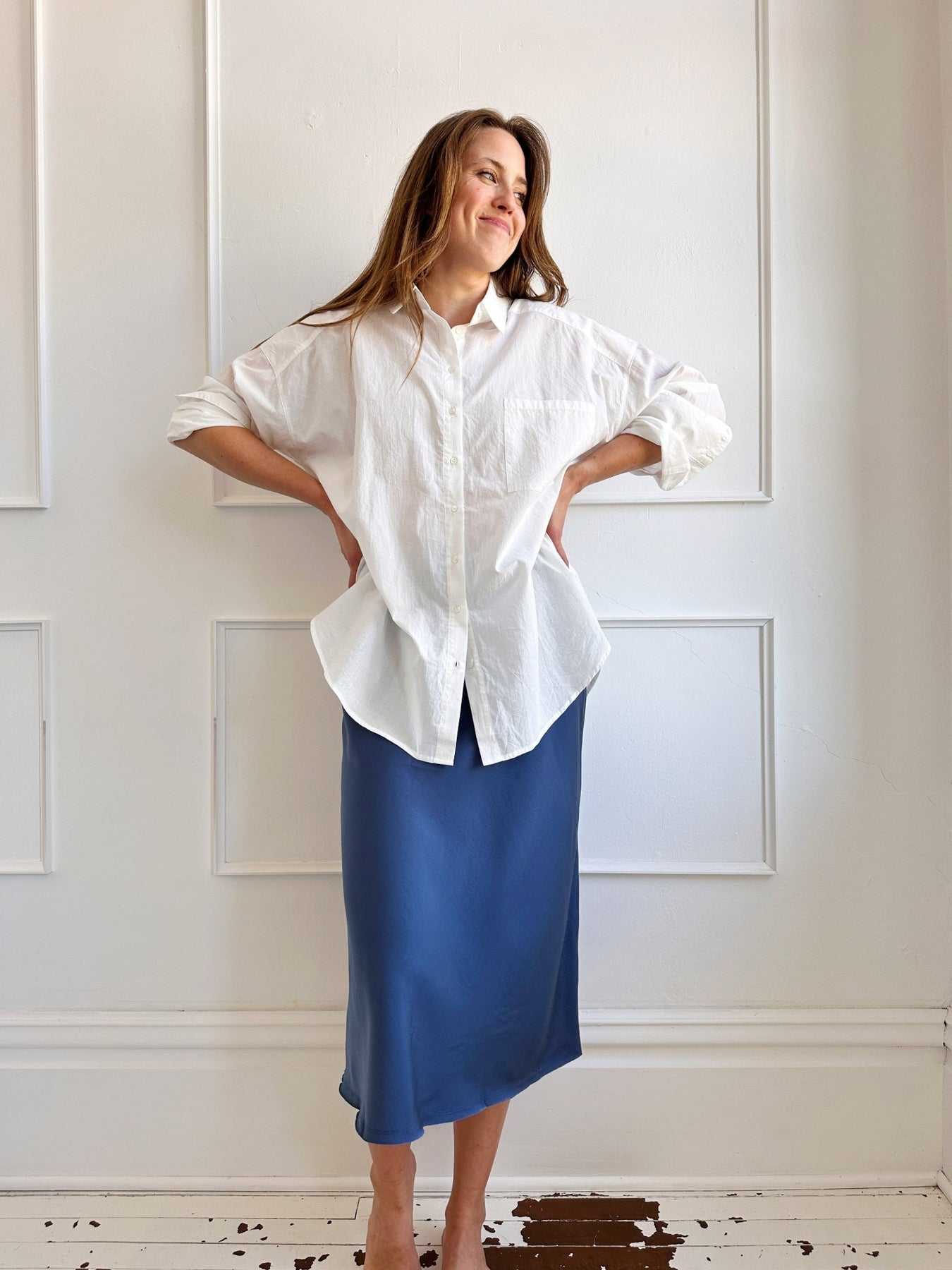 This satin midi skirt glides with a soft sheen and effortless movement. Its simple silhouette makes it endlessly versatile—equally at ease with a cozy knit or a delicate blouse.